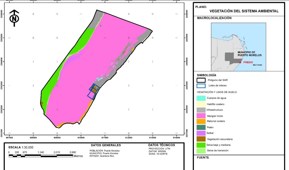 En el mapa que presenta la empresa, los predios que pretenden desarrollar aparecen marcados con “matorral costero”, en lugar de manglar, como el resto de la zona.