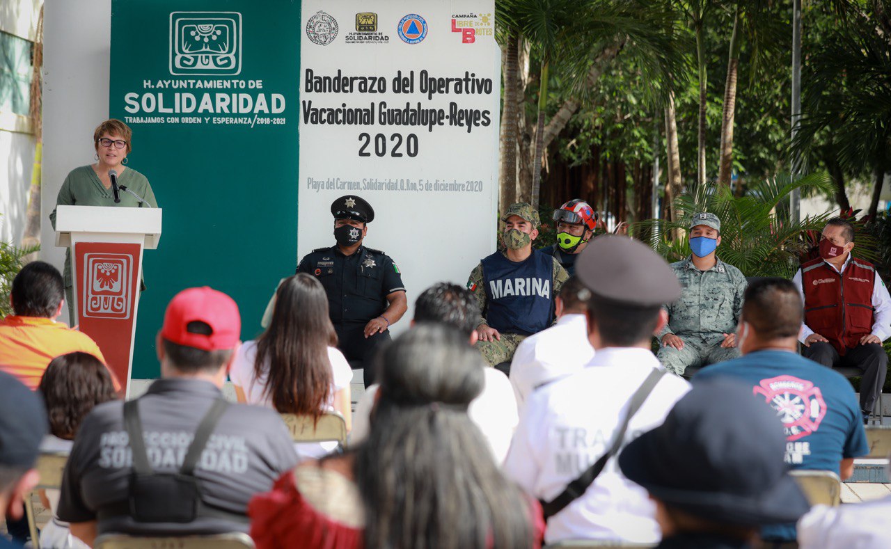 Playa del Carmen, Quintana Roo, 5 de diciembre del 2020.-Con la presencia de titulares y representantes de las corporaciones de seguridad pública de los tres niveles de gobierno -Guardia Nacional, Bomberos, cuerpos de emergencias y Protección Civil-, la presidenta municipal, Laura Beristain Navarrete, dio el banderazo de inicio del “Operativo Vacacional Guadalupe-Reyes 2020”, donde participan más de mil elementos para reforzar la seguridad, atención a los turistas y la ciudadanía en general.
