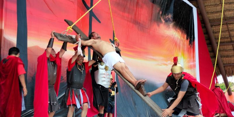 Docenas de familias celebran este Viernes Santo presenciando el tradicional Viacrucis, pasión y muerte de Jesucristo, en el popular Parque de las Palapas, de la Supermanzana 22.