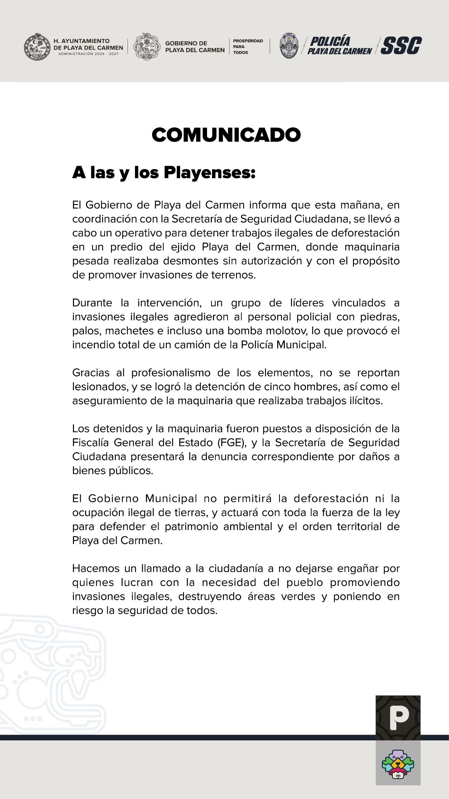 Ante los hechos el gobierno de Playa del Carmen que encabeza Estefanía Mercado emitió el siguiente comunicado: