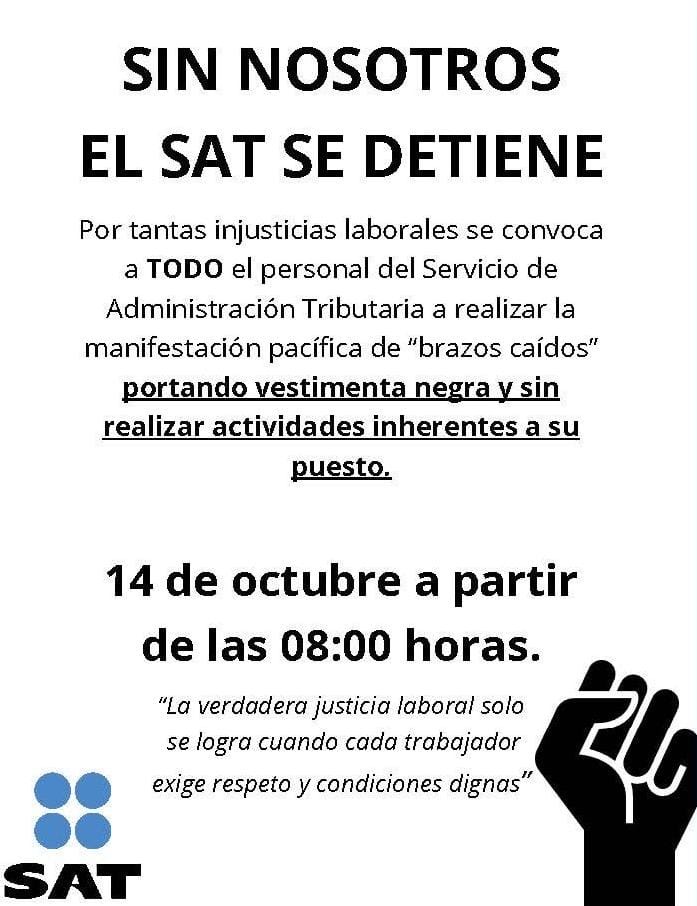 Trabajadores del Servicio de Administración Tributaria (SAT) anuncian protesta nacional “de brazos caídos” en todas sus representaciones del país, bajo el lema “Sin nosotros el SAT se detiene”.