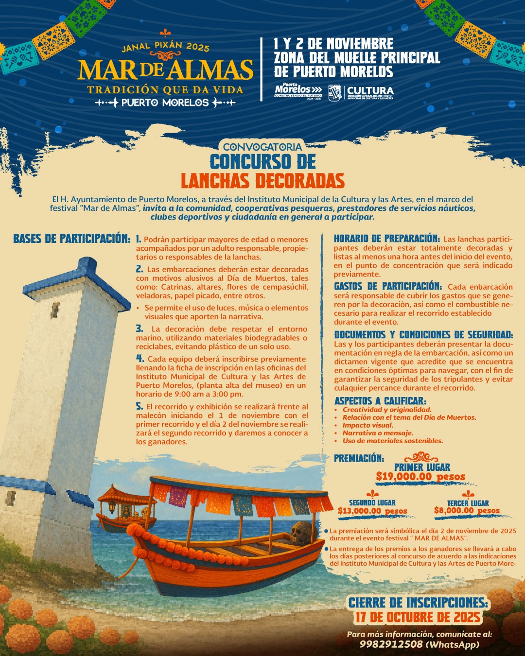 La directora del Instituto Municipal de Cultura y las Artes, Adriana Nava Gómez, instancia organizadora del Festival, dio a conocer que se lanzó la convocatoria en una edición del Janal Pixan 2025, con la nueva propuesta para que participen embarcaciones que harán brillar la costa de Puerto Morelos en dos días de recorrido para deleite de residentes y turistas.