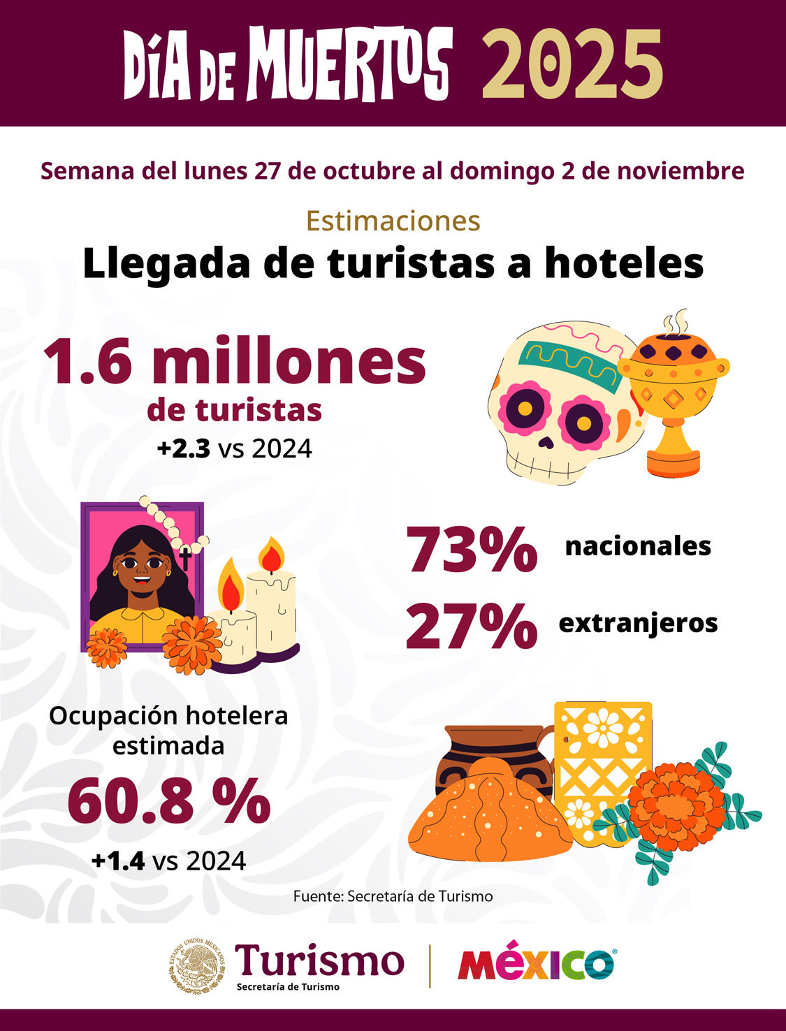 La titular de la Secretaría de Turismo (Sectur) informó que con motivo de la celebración del Día de Muertos, la ocupación hotelera en el país superará 1 millón 608 mil turistas, lo que representa un incremento del 2.3% respecto al año anterior.
