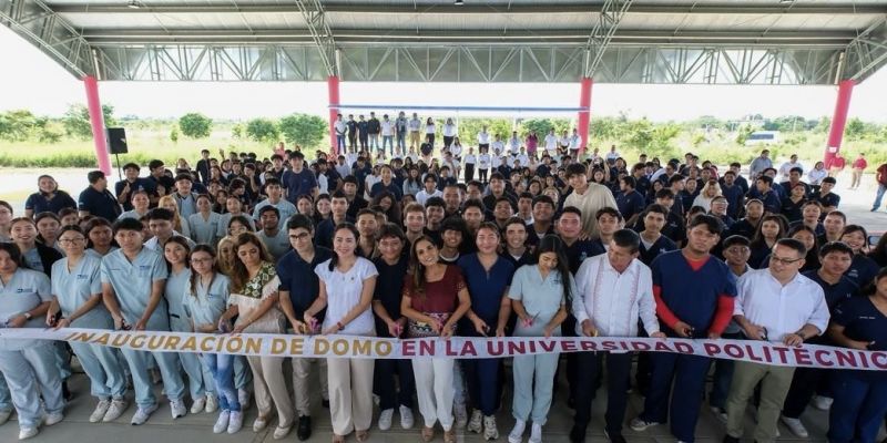 La gobernadora Mara Lezama Espinosa inauguró en la Universidad Politécnica de Bacalar un nuevo domo con cancha doble de usos múltiples, en donde la inversión educativa verificada es superior a los 8.3 millones de pesos beneficia a 476 alumnos, 255 mujeres y 221 hombres, de las 10 carreras que se imparten en esta institución.