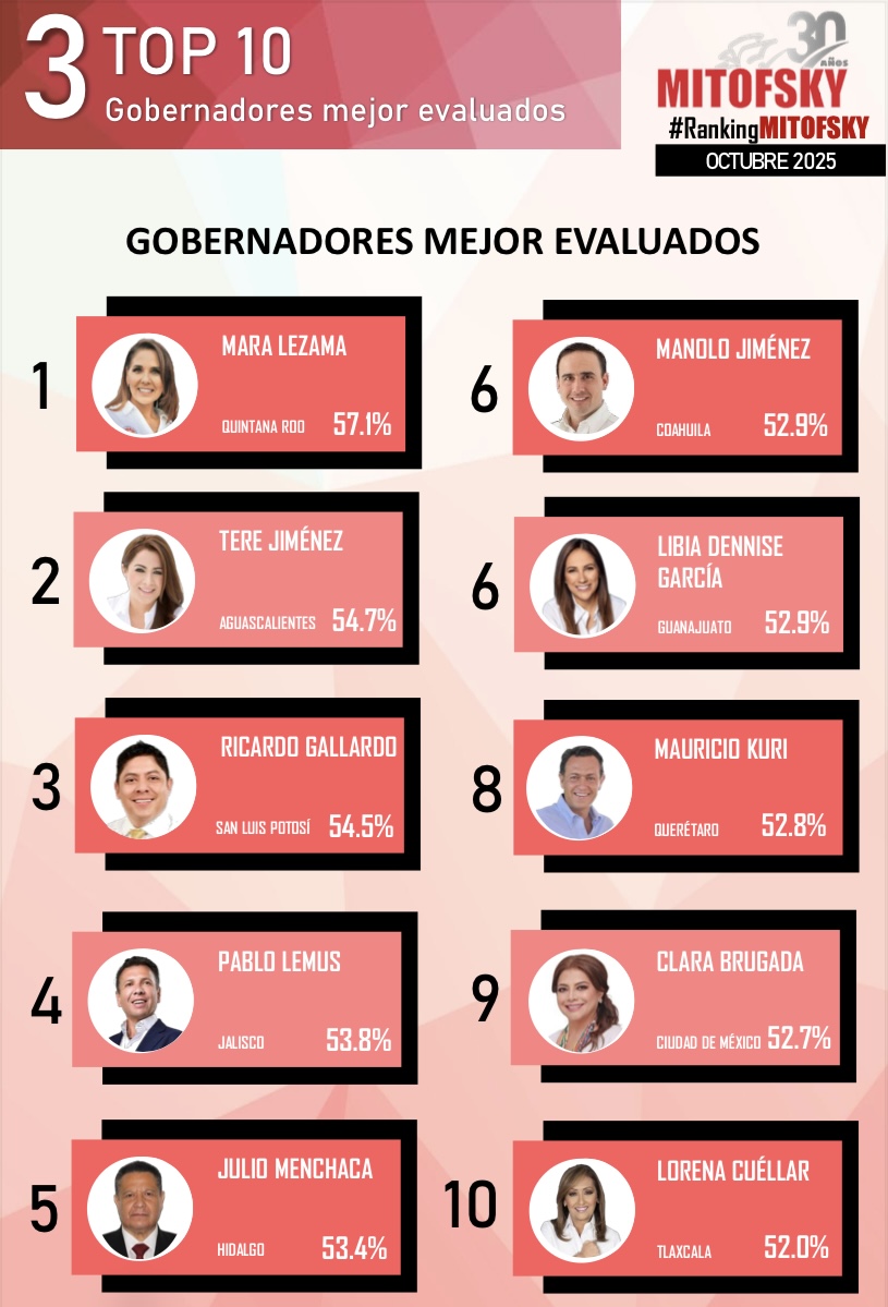 La gobernadora de Quintana Roo, Mara Lezama Espinosa, se mantiene como la número uno del Ranking de Gobernadores de Mitofsky correspondiente a octubre, reafirmando su liderazgo nacional en un mes particularmente complicado para el país.