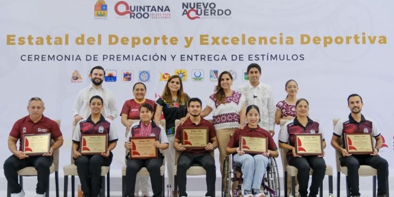 En el Centro Internacional de Negocios y Convenciones de Chetumal, Mara Lezama entregó reconocimientos a los ganadores del Premio Estatal del Deporte 2025: Andrés Dupont Cabrera, en la categoría de Deportista Convencional; Lya Daniela Sánchez Tadeo, Deportista Adaptado; Carlos Alberto Matos Zavala, entrenador de Levantamiento de Pesas; Yasmín Hernández Varela, entrenadora de Paradanza Deportiva; y la profesora Georgina Tatiana Roque Roque, Fomento Deportivo.