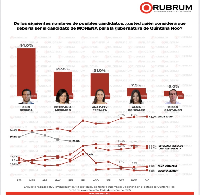 De acuerdo con la más reciente medición de la casa encuestadora Rubrum, Gino Segura y Estefanía Mercado encabezan las preferencias internas de Morena rumbo a la definición de su candidatura para la gubernatura de Quintana Roo en 2027.