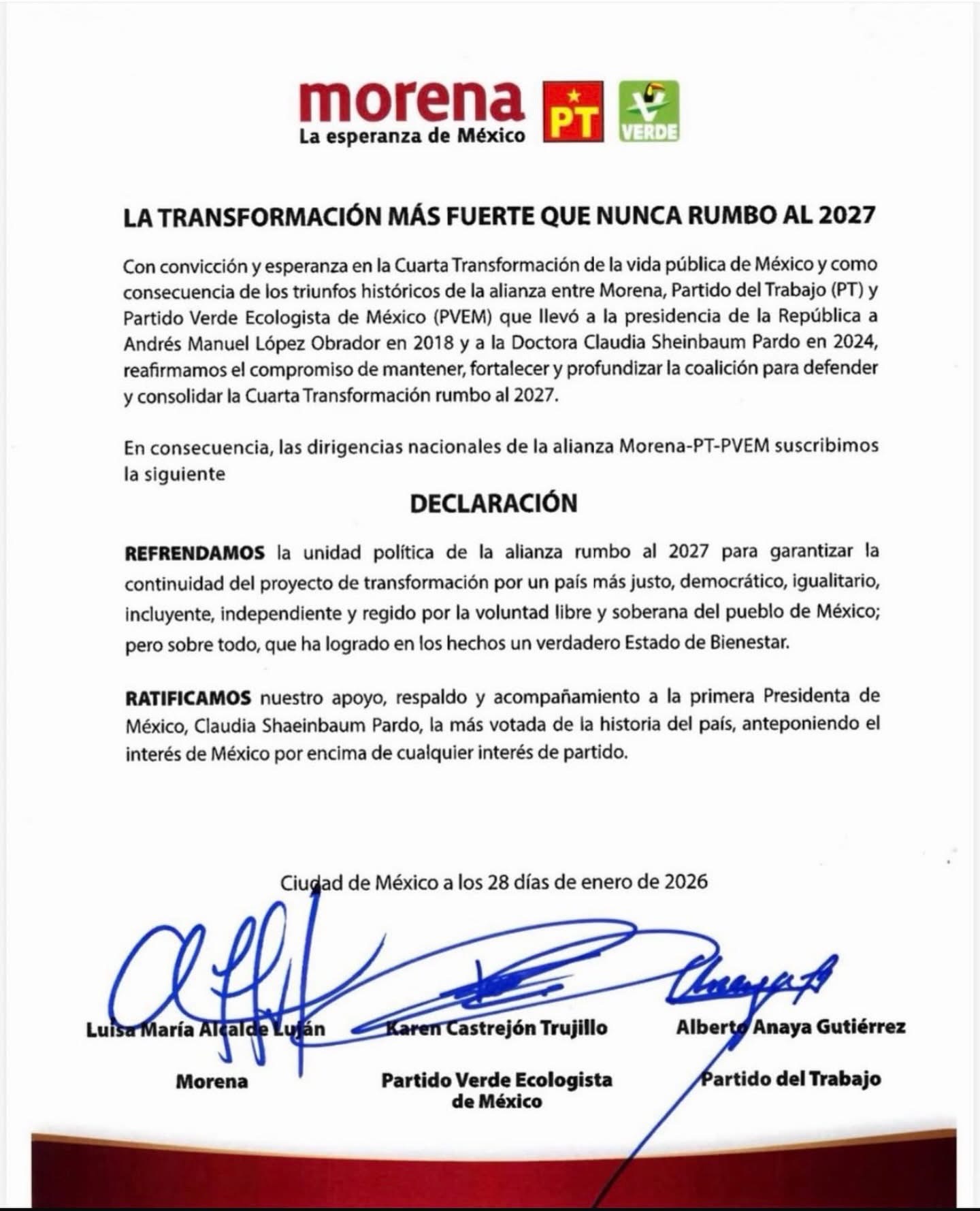 “Refrendamos la unidad política de la alianza rumbo al 2027 para garantizar la continuidad del proyecto de transformación por un país más justo, democrático, igualitario, incluyente, independiente y regido por la voluntad libre y soberana del pueblo de México”, dijo.