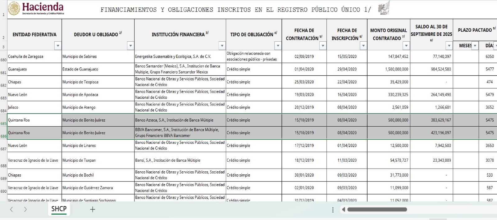 De ahí se desprenden los datos donde Solidaridad (Playa del Carmen) a 45 días de terminar la administración de Lili Campos Miranda (2021-2024), contrató el 12 de agosto de 2024 una deuda de 493 millones 855 mil 837 pesos a ‘BBVA México, S.A. Institución de Banca Múltiple, Grupo Financiero BBVA México y un plazo para pagar de 9.54 años, es decir, los playenses están endeudados hasta el 2034; el saldo al 30 de septiembre de 2025 es de 428 millones 478 mil 620 pesos. El porcentaje afectado de las participaciones que recibe el Municipio es del 50 por ciento.
