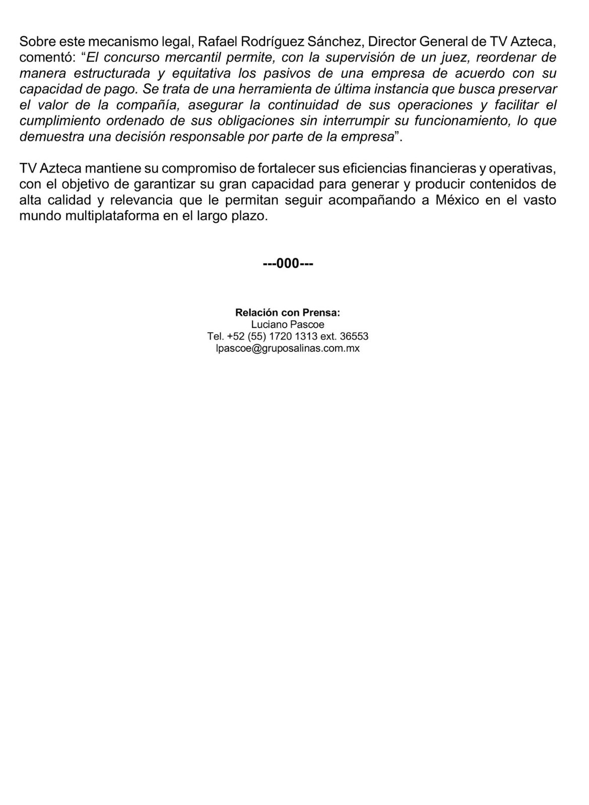 “Se trata de una herramienta de última instancia que busca preservar el valor de la compañía, asegurar la continuidad de sus operaciones y facilitar el cumplimiento ordenado de sus obligaciones sin interrumpir su funcionamiento”, dijo en un comunicado Rafael Rodríguez Sánchez, director general de TV Azteca.