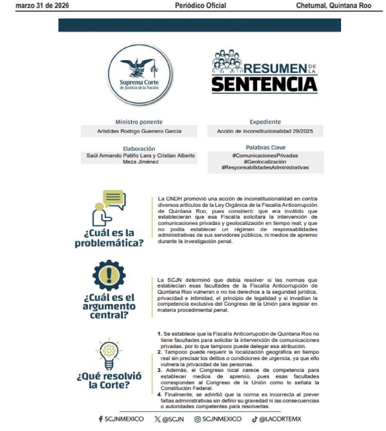 La resolución de la SCJN fue impugnar los artículos 11, fracción XXXIII, 17, inciso A), fracción XXX, 23, fracción XIII, en la porción normativa “intervención de comunicaciones privadas, localización geográfica en tiempo real”, 43, 44 y 45 de la Ley Orgánica de la Fiscalía Especializada en Combate a la Corrupción del Estado de Quintana Roo, expedida mediante Decreto Número 085, publicado en el Periódico Oficial del Estado deQuintana Roo, el 10 de enero de 2025.