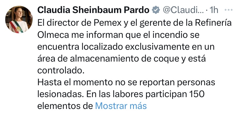 “El director de Pemex y el gerente de la Refinería Olmeca me informan que el incendio se encuentra localizado exclusivamente en un área de almacenamiento de coque y está controlado. Hasta el momento no se reportan personas lesionadas. En las labores participan 150 elementos de Pemex, con el apoyo de personal de Marina, Defensa y del gobierno estatal. Pemex continuará informando a través de sus canales oficiales.El director de Pemex y el gerente de la Refinería Olmeca me informan que el incendio se encuentra localizado exclusivamente en un área de almacenamiento de coque y está controlado. Hasta el momento no se reportan personas lesionadas. En las labores participan 150 elementos de Pemex, con el apoyo de personal de Marina, Defensa y del gobierno estatal. Pemex continuará informando a través de sus canales oficiales”.