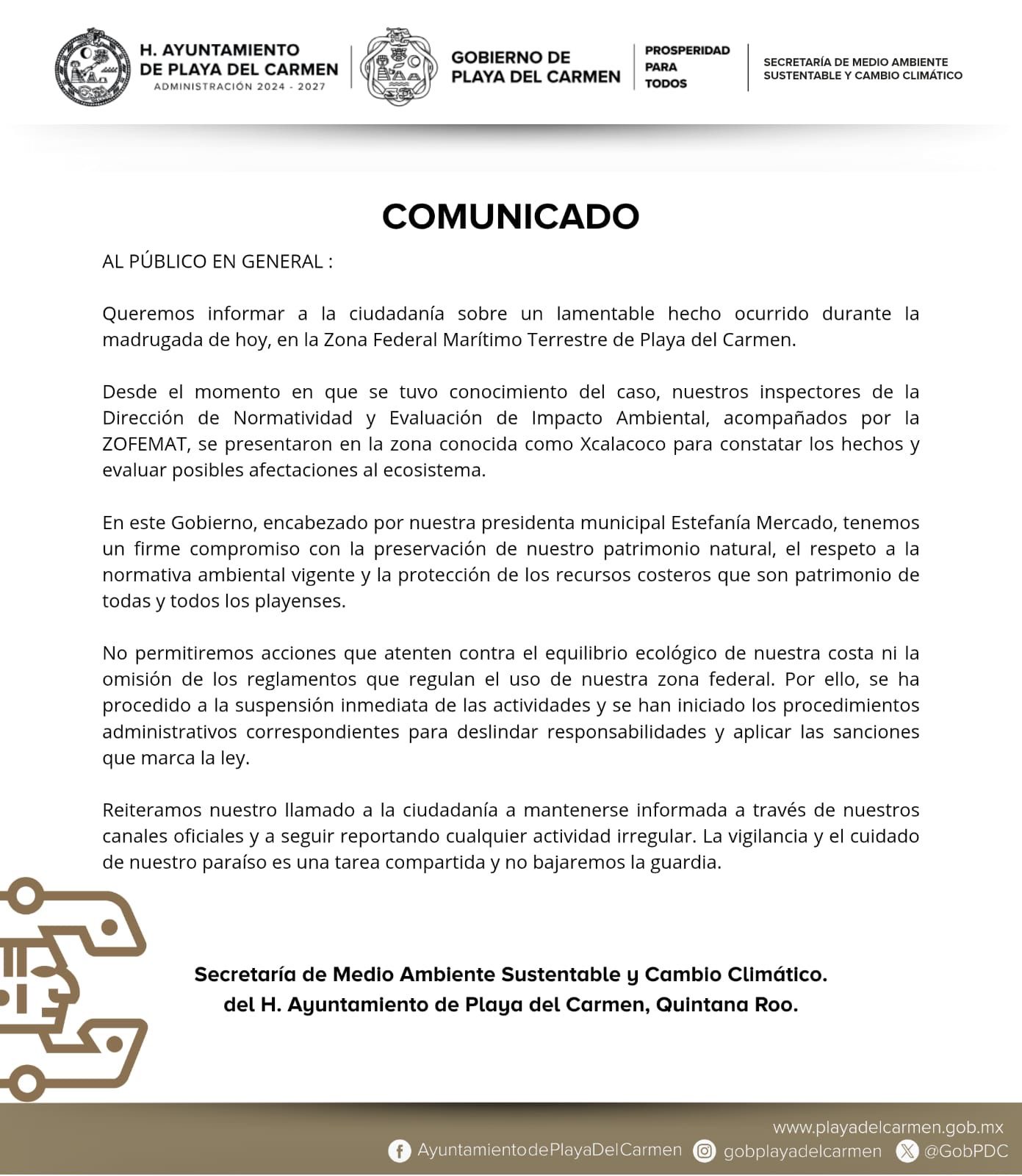 A través de un breve comunicado, el gobierno municipal que encabeza Estefanía Mercado , sostuvo que no habrá tolerancia para acciones que vulneren el equilibrio ecológico de Playa del Carmen.